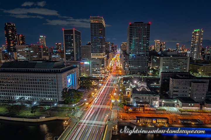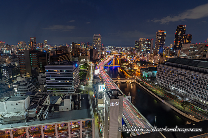 特に素晴らしいのが夕暮れ時の西側で、堂島川と阪神高速、ビル群が織りなす夜景は必見。中央公会堂を望む東側もよいですが、御堂筋がまっすぐ伸びる、実に大阪らしい景観を望める南側も素晴らしいです。